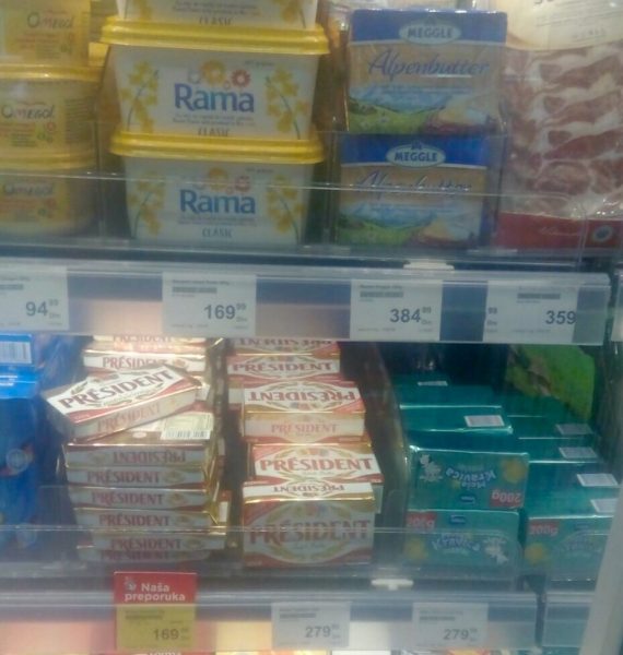 Ali šta znaju Nemci šta je istorijski maksimum? Treba da dodju u Srbiju, pa kao Ekonomske Vesti u Maksi: pakovanje od 250 grama Alpenbutter kompanije Meggle staje 385 dinara što je više od 3,2 evra. I ne samo da je 250 grama butera kod nas za dobru trećinu skuplje nego u Aldiju, nego je i 200 grama kod nas skuplje nego 250 grama kod njih. U Maksiju 200 grama Imlekovog butera staje 280 dinara ili oko 2,3 evra.