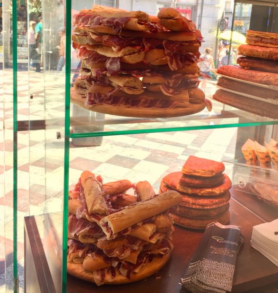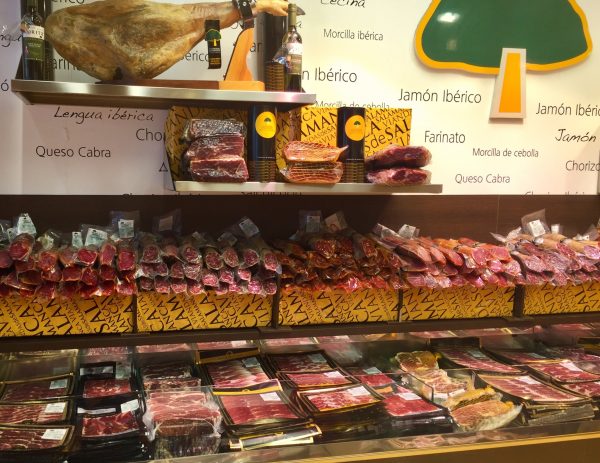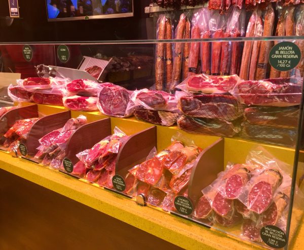 Pršute na sve strane. U vitrinama, frižiderima, na zidovima, pa čak i na plafonu. Za one koji nemaju vremena da sačekaju da im se cela pršuta skine s plafona (a ni novca – kilogram iberijske pršute „Gran Reserva“ je 46,3 evra), pa s njom pod mišku, na raspolaganju su sendviči.