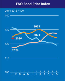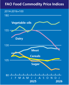 FAO indeks cena prehrambenih proizvoda, kojim se izražavaju promene medjunarodnih cena korpe globalno trgovanih prehrambenih proizvoda, pao je u januaru za 0,4 procenta u odnosu na prethodni mesec pre svega zahvaljujući nižim medjunarodnim kotacijama za mlečne proizvode (-5%), šećer (-1%)i meso (-0,4%).Taj je indeks u januaru bio niži za 0,6 odsto nego godinu dana ranije (mlečni proizvodi -14,9%, šećer -19,2%, ali meso +6,1%)