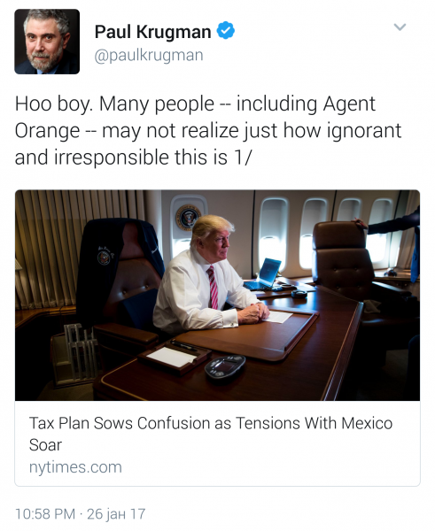 Nobelovac Pol Krugman iskoristio je omiljeni kanal komunikacije američkog predsednika Donalda Trampa – Tviter – da objasni neodgovornost i neznanje koje se, po njemu, kriju iza najave Trampa da će carinom od 20 odsto finansirati zid izmedju SAD i Meksika. Pošto je Meksiko „nerazumno“ odbio da izgradnju tog zida plati.