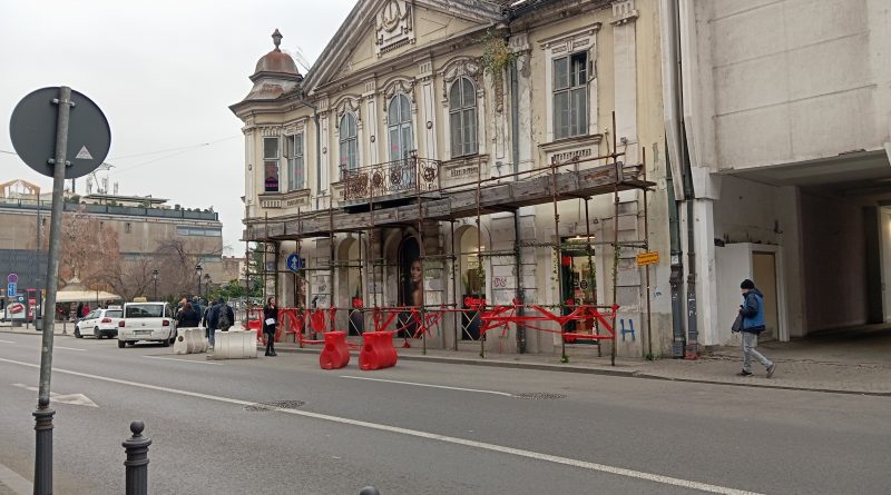 Zgrada je najpre opasana nekim skelama, mada se golim okom ne može zapaziti da se na njoj nešto radi, kroz koje u velikom broju prolaze pešaci, onda je u njeno prizemlje useljena velika parfimerija, pa je na one skele okačen opušten poziv „Pešaci predjite na drugu stranu“, pa je otprilike trećina kolovoza odvojena dobro vidljivim preprekama te su pešaci tako pozvani da kuću obilaze hodajući tim delom kolovoza…kad je napadao sneg, nestalo je prepreka, pa smo sad opet na početku.Kad se suočiš s natpisom “ Pešaci, predjite na drugu stranu“, već ti je kasno da to učiniš, sem ako ne žuriš baš nikud,pa ti je sve vreme ovog sveta na raspolaganju, a bezbednosna kultura iznad uzornog nivoa.